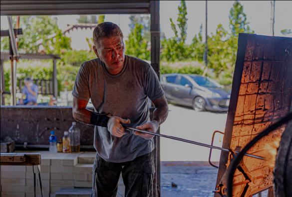 冷めやすく、成形しづらい廃瓶は、瞬間の芸術です。型にはめることなく、ガラスの流れるままに、「技」という彩りを添えています。